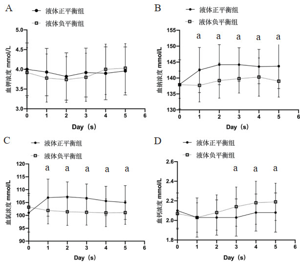| A:液体正平衡组和液体负平衡组患者入ICU后5 d(D1-5)血清钾离子浓度;B:液体正平衡组和液体负平衡组患者入ICU后5 d(D1-5)血清钠离子浓度;C:液体正平衡组和液体负平衡组患者入ICU后5 d(D1-5)血清氯离子浓度;D:液体正平衡组和液体负平衡组患者入ICU后5 d(D1-5)血清钙离子浓度(aP<0.05) 图 1 比较液体正平衡组和液体负平衡组患者入ICU后5 d(D1-5)血清电解质浓度 Fig 1 Comparison of serum electrolyte between the positive fluid balance and negative fluid balance group from day 1 to day 5 |