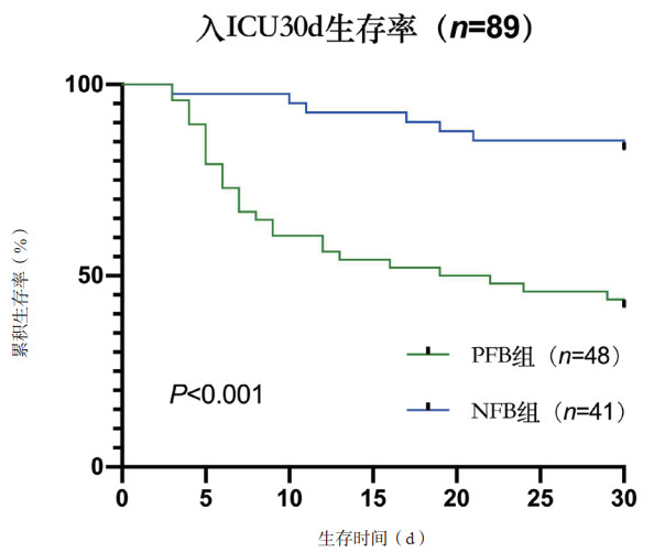 NFB组(n=41)患者入ICU后30 d生存率高于PFB组(n=48)(P<0.001),见图 2。