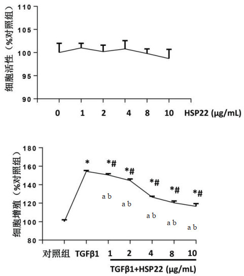 图注:CCK8检测细胞活性,%表示各组与对照组的百分比;与对照组比较, aP<0.05;与TGFβ1组比较,bP<0.05 图 1 Hsp22对细胞增殖的影响 Fig 1 Effect of Hsp22 on cell proliferation