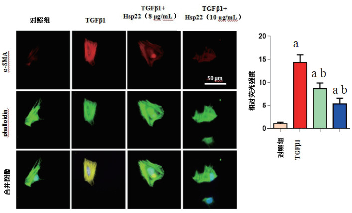 图注:镜下可见α-SMA(红色)的表达,放大倍数400倍,绿色表示phalloidin(鬼笔环肽),蓝色表示细胞核。与对照组比较, aP<0.05);与TGFβ1组比较, bP<0.05 图 2 Hsp22对α-SMA表达的影响 Fig 2 Effect of Hsp22 on α-SMA expression