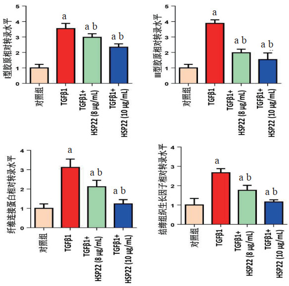 图注:与对照组比较aP<0.05;与TGFβ1组比较bP<0.05 图 3 Hsp22对促纤维化因子转录水平的影响 Fig 3 Effect of Hsp22 on transcription level of fibrotic factor