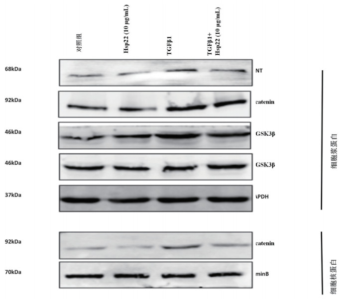 SPF级小鼠由湖北省实验动物研究中心提供,实验动物合格证号:SYXK(鄂)2015-0027。细胞培养相关试剂:链青霉素双抗、胰酶、血清和DMEM培养基来源于美国Hyclone公司。TGFβ1来源于美国ProteinTech公司。实验所用一抗:α-SMA、WNT、β-catenin、P-GSK3β、T-GSK3β、GAPDH、LaminB购买于英国Abcam公司。重组人Hsp22蛋白(ab119152)购买于英国Abcam公司。CCK8细胞增殖试剂盒购买于日本同仁公司。