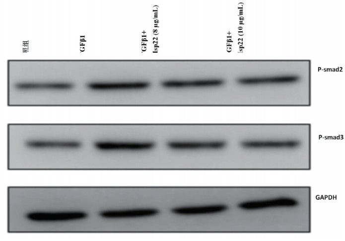 检测经典的TGFβ-smad信号通路,免疫印迹发现smad2和smad3的磷酸化水平在TGFβ1组明显升高,而TGFβ1+8 μg/mL Hsp22组smad2和smad3的磷酸化水平与TGFβ1组差异无统计学意义(P>0.05);TGFβ1+10 μg/mL Hsp22组smad2和smad3的磷酸化水平低于TGFβ1组(P<0.05)(图 6表 3)。