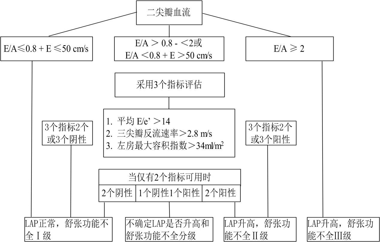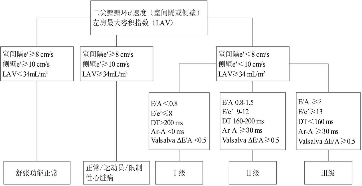 1.5 舒张功能不全诊断与分级标准如图 1和图 2所示,2009年版诊断标准[11]:⑴左房最大容积指数≥34 mL/m2;⑵二尖瓣瓣环e'速度下降(室间隔e'< 8 cm/s,侧壁e'< 10 cm/s);⑶根据E/A、E/e'、DT、Ar-A及Valsalva动作ΔE/A区分不同严重程度。