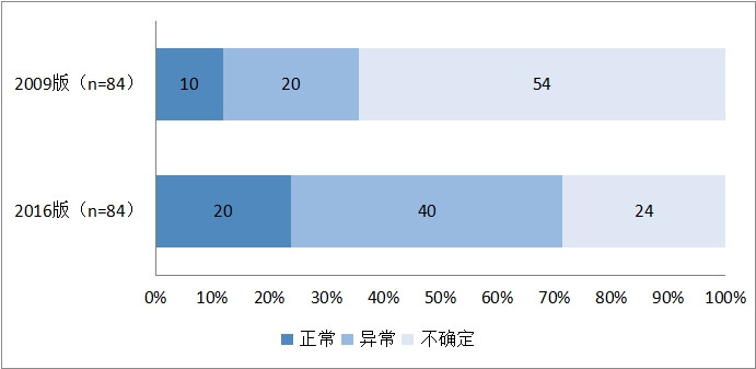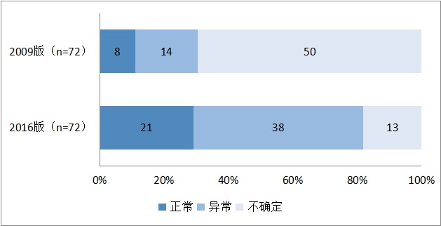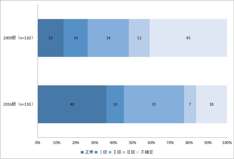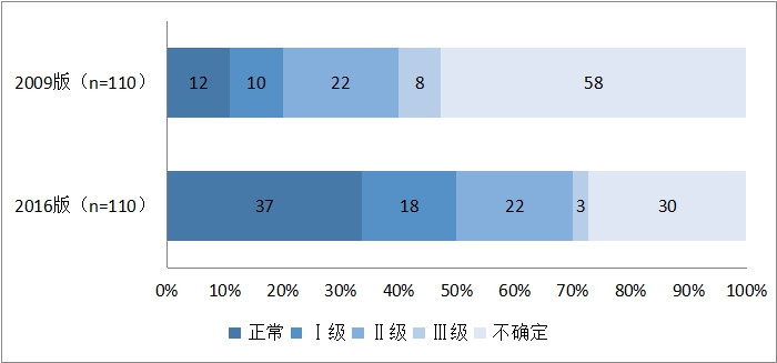在入ICU第3天,根据2016年版指南,40例(36%)患者舒张功能正常,52例(47%)被诊断为舒张功能不全,18例(18%)为舒张功能不全不确定。根据2009年的指南,其中15例(14%)患者舒张功能正常,50例(46%)被诊断为舒张功能不全,45例(41%)为舒张功能不全不确定。同样,诊断分级构成比差异较大(Z=4.60,P < 0.01)。见图 4。