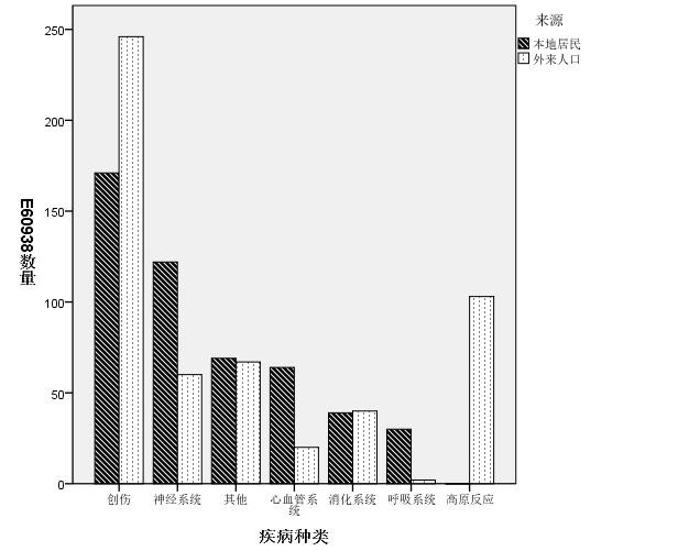 2 结果 2.1 阿里地区流行病学分析 2.1.1 阿里地区院前急救病种分析如表 1所示,在1 033例院前急救患者中,男性768例(74.34%),女性265例(25.66%)。从年龄构成比来看,以18~60岁的中青年为主,共830例(80.35%)。本地居民495例(47.92%),外来人口538例(52.08%)。创伤导致的急救量占总量的40.37%,不论是外来人员246例(45.72%)还是本地居民171例(34.55%)均最为常见(图 1),其中交通伤占创伤的66.43%。在本地居民中,神经系统疾病(如脑出血、脑梗死、癫痫等)122例(24.65%)占第二位;而外来人口中高原反应103例(19.70%)占第二位。在总人口中神经系统疾病有182例(13.17%)。其他种类疾病(妇产科疾病、泌尿系统疾病、中毒等)由于包含种类较多,占第三位。