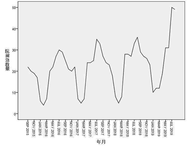 | 图 2 2015年9月-2019年7月阿里地区院前急救量 Fig 2 Pre-hospital emergency volume in Ali from september 2015 to July 2019 |