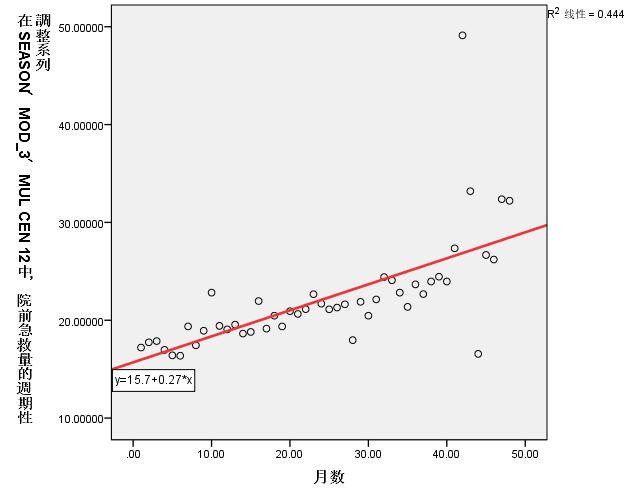 如图 2所示,每年4至12月阿里地区急救量会出现周期性增高的现象,7至9月达到峰值。通过时间序列周期性分析,在排除周期性影响因素后,阿里地区院前急救量随时间仍呈逐渐增长的趋势,回归方程Y=15.7+0.27X,F=36.809,P < 0.05,R2=0.444,见图 3。