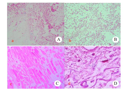 A:患者坏死组织涂片镜下观,可见G-弧菌(HE×1 000);B:菌落涂片镜下观,可见大量G-弧菌(HE×1 000);C:肌纤维肿胀、溶解(HE×400);D:高倍镜下可见弧菌(HE×1 000) 图 1 感染部位组织病原学及病理学检查