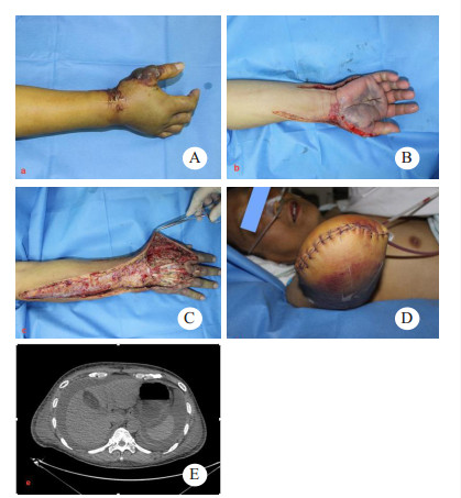 A:患肢极度肿胀,皮肤瘀斑,起水疱,手指活动障碍;B:掌侧皮肤瘀斑,指端有缺血表现;C:术中见筋膜间大量洗肉水样渗液,无积气,无化脓,无明显臭味,肌肉组织肿胀,颜色晦暗,电凝无收缩;D:患者截肢术后病情改善,感染指标下降,伤口愈合较好(中间好转期);E:腹部CT提示肝硬化 图 2 患者典型病例图片