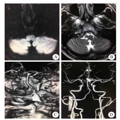 | A:首次磁共振检查DWI阴性;B:半年后复诊T2WI可见右侧延髓软化灶;C:首次头颅CTA可见左侧椎动脉线珠样改变(箭头示);D:半年后复查CTA椎动脉夹层愈合 图 1 例1患者影像学检查结果 |