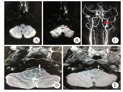 | A:首次头颅DWI检查结果阴性;B:48 h后复查头颅DWI可见左侧延髓背外侧高信号(箭头示);C:颈部血管ceMRA可见左侧椎动脉局部狭窄(箭头示);D、E:高分辨率磁共振可见血管壁间半月形高信号(箭头示) 图 2 例2患者影像学检查结果 |