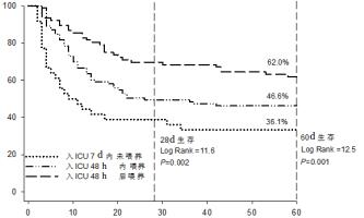 P值显示Log-rank检验不同喂养时机患者之间生存率存在差异 图 1 Kaplan-Meier曲线按照入ICU不同EN时机预测血流动力学不稳定的重症患者28 d和60 d死亡风险。 Fig 1 The Kaplan-Meier curve stratifi ed on the basis of different EN time on admission to ICU for 28- and 60-day mortality in critically ill patients with hemodynamic instability.