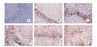 | A:正常组,B:DEACMP组造模1d, C:DEACMP组造模7d, D:DEACMP组造模14d, E:DEACMP组造模21d, F:DEACMP组造模28 d. 图 2 海马CA3区iNOS的表达(免疫组织化学x400) Fig 2 Expression of iNOS in the CA3 area of the hippocampus(immunohistochemistry x 400) |
