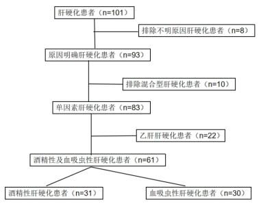 2 结果 2.1 —般情况比较研究期间共有失代偿性肝硬化患者101例,最后入选DSC患者30人,DAC患者31人(入选流程见图 1)。DAC患者全部男性,明显高于DSC组(100% vs 25%, P < 0.001), 这与我国嗜酒者主要为男性有关;但DSC患者年龄明显偏年老[(73.50±12.54) vs (59.39±8.29)岁, P < 0.001],这可能与DSC患者病程较晚才出现失代偿相关。DSC患者合并冠心病较多[13(43.3%) vs. 3(9.7%), P=0.003],可能与DSC患者年龄较大有关。