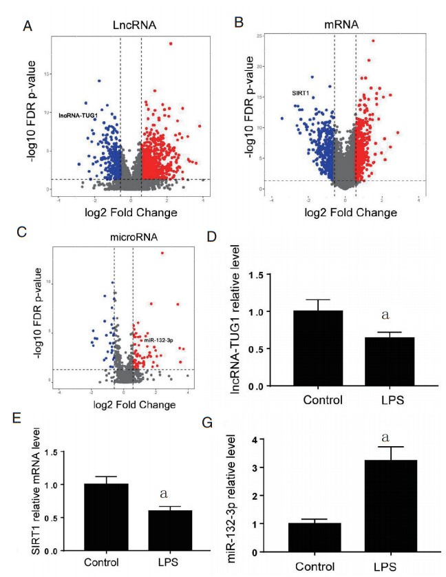 A-C:RNA测序数据显示LPS处理24 h后HIEC-6细胞出现了部分lncRNA、mRNA及microRNA的表达差异;D:qRT-PCR结果显示LPS处理24 h后HIEC-6细胞出了LncRNA-TUG1的表达降低;E-F:qRT-PCR及western blot的结果显示LPS处理24 h后HIEC-6细胞的SIRT1 mRNA及蛋白水平出现降低;G:qRT-PCR结果显示LPS处理24 h后HIEC-6细胞出了LncRNA-TUG1的表达降低。与对照组比较,aP < 0.05 图 1 脂多糖处理24 h后的HIEC-6细胞出现lncRNA-TUG1、miR-132-3p及SIRT1的表达变化 Fig 1 Expression changes of LncRNA-TUG1, miR-132-3p and SIRT1 in HIEC-6 cells treated with LPS for 24 h