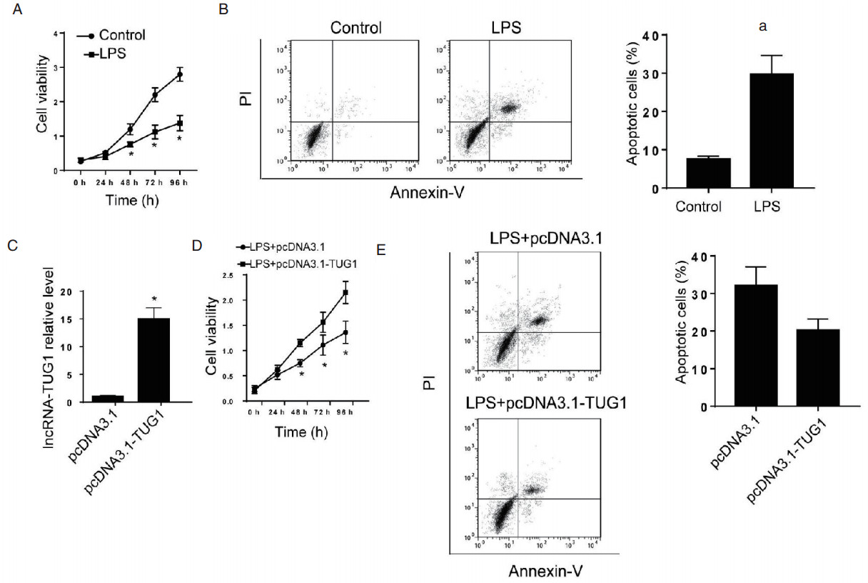 A:CCK-8分析显示LPS处理可以显著抑制HIEC-6细胞的增殖;B:流式细胞分析提示LPS处理24 h可以引起HIEC-6细胞凋亡;C:qRT-PCR验证了pcDNA3.1-TUG1用于过表达LncRNA-TUG1的效果;D:CCK-8分析显示过表达LncRNA-TUG1部分消除了LPS引起的增殖抑制;E:流式细胞分析提示过表达LncRNA-TUG1部分消除了LPS引起的细胞凋亡。与转染pcDNA3.1空质粒相比较,aP < 0.05。 图 2 LncRNA-TUG1的过表达可以减轻LPS诱导的HIEC-6细胞损伤 Fig 2 Overexpression of LncRNA-TUG1 alleviated LPS-induced injury in HIEC-6 cells
