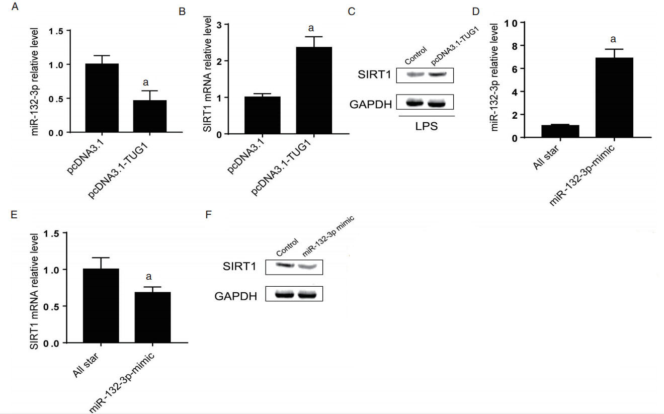 A:qRT-PCR显示过表达LncRNA-TUG1可以抑制HIEC-6细胞的miR-132-3p的水平;B-C:qRT-PCR及western blot的结果显示过表达LncRNA-TUG1增加了SIRT1的mRNA及蛋白水平;D-F:qRT-PCR及western blot的结果显示过表达miR-132-3p降低了SIRT1的mRNA及蛋白水平。与转染pcDNA3.1空质粒和All star阴性转染对照相比较,aP < 0.05 图 3 LncRNA-TUG1可以通过miR-132-3p调控SIRT1的表达 Fig 3 LncRNA-TUG1 regulated the expression of SIRT1 through miR-132-3p in HIEC-6 cells