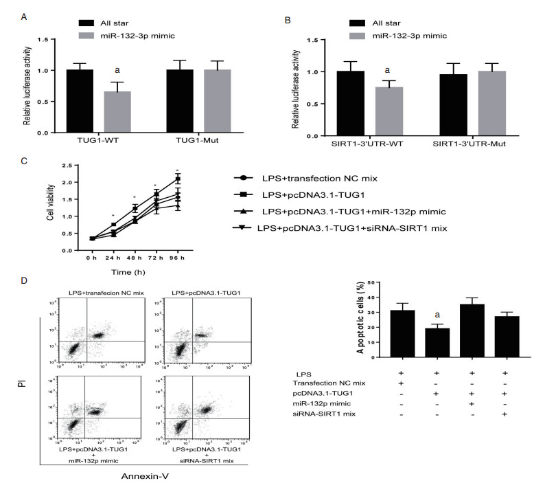 Trizol试剂提取LPS处理24 h或转染48 h后的各组细胞的总RNA。对总RNA样本进行质量及定量检测后进行cDNA的反转录。为检测LncRNA-TUG1和SIRT1 mRNA,提取的RNA使用RevertAid H Minus Reverse Transcriptase试剂盒进行反转录,得到的cDNA使用SYBR Green qPCR Master试剂盒进行扩增定量。LncRNA-TUG1的上游引物为:5’-TAGCAGTTCCCCAATCCTTG-3’下游引物为:5’- CACAAATTCCCATCATTCCC-3’。SIRT1的上游引物为:5’- TAGCCTTGTCAGATAAGGAAGGA-3’下游引物为:5’- ACAGCTTCACAGTCAACTTTGT-3’。内参GAPDH的上游引物为:5’- TGTGGGCATCAATGGATTTGG-3’下游引物为:5’- ACACCATGTATTCCGGGTCAAT-3’。为检测miR-132-3p,总RNA使用miRNA First Strand cDNA合成试剂盒进行反转录。合成的cDNA使用MicroRNAs qPCR试剂盒进行扩增定量;miR-132-3p的上游引物为:5’- TAACAGTCTACAGCCATGGTCG-3’下游引物为试剂盒内通用引物。内参U6的上游引物为:5’- CTCGCTTCGGCAGCACA-3’下游引物为:5’- AACGCTTCACGAATTTGCGT-3’。目的基因的相对表达量采用2-△△CT法进行计算。