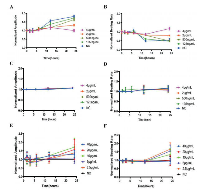| 原代新生大鼠在LPS(0~4 μg/mL)作用下的搏动幅度(A)和搏动频率(B);hiPS-CMs在低浓度LPS(0~4 μg/mL)作用下的搏动幅度(C)和搏动频率(D)和hiPS-CMs在高浓度LPS(2.5~40 μg/mL)作用下的搏动幅度(E)和搏动频率(F) 图 1 LPS对hiPS-CMs和原代新生大鼠CMs的收缩作用 Fig 1 Contractile effect of LPS on hiPS-CMs and neonatal rat CMs |
