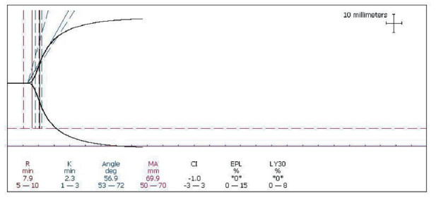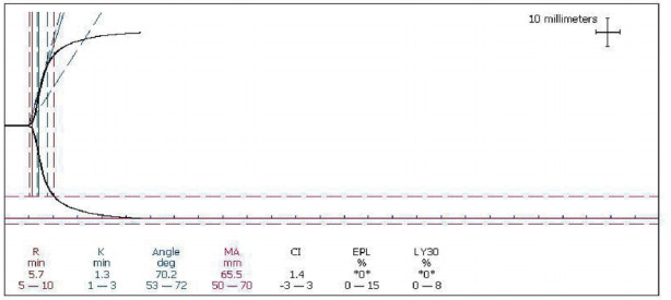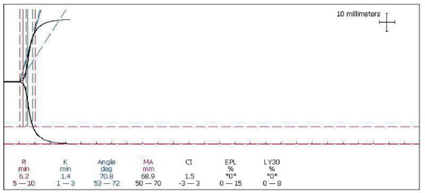回顾性收集空军军医大学西京医院急诊科2015年10月至2020年1月TEG临床检测各项指标均在正常参考范围内(R时间:5~10 min,K时间:1~3 min,Angle角度:53~72°,MA值:50~70 mm,CI:-3~3)的报告结果94份作为E组,五项指标中任意一项指标超过正常参考范围均排除在外,所有患者对检查方案均知情同意。