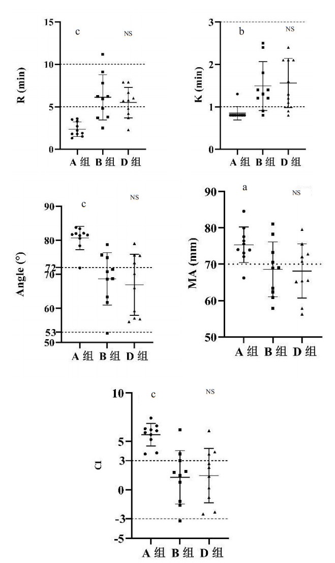 B组(1:3)与A组(1:9)相比,R时间和K时间延长,Angle角度、MA值和CI值减小,各检测指标两两比较差异均有统计学意义(P<0.05)(见图 6)。C组(1:1)R>20 min,未检测出其他指标结果(见图 4)。