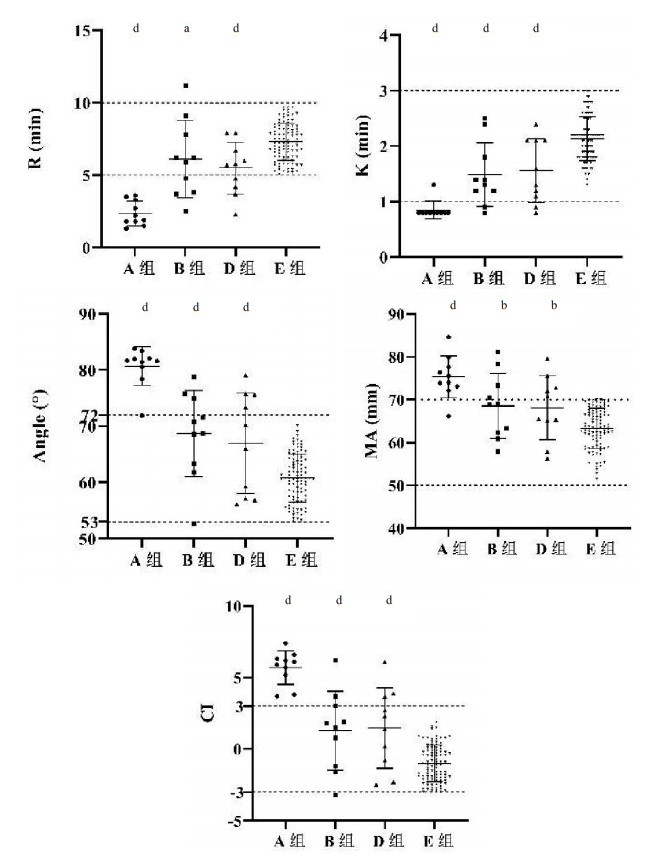 B组(250μL:750μL)与D组(100μL:300μL)的R时间、K时间、Angle角度、MA值和CI值两两相比,差异均无统计学意义(P>0.05)(见图 6)。