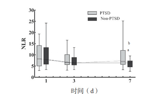 PTSD组在创伤后7 d内的NLR值持续增高;非PTSD组呈明显下降趋势,创伤后第7天NLR值明显低于入院当天(P= 0.001)。见图 2。