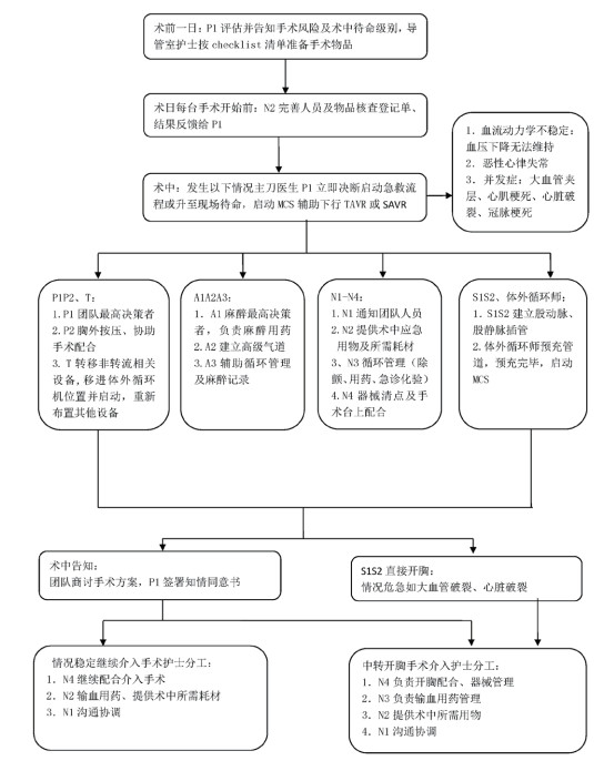 本中心基于不断临床实践,于2015年5月行团队讨论后组建由以上人员组建的救护流程,并在不断实践和反馈中优化改进,见图 1。(1)术前一日流程:①心内介入医生专科群提前一天告知手术患者基本情况,给出一线待命(导管室待命,循环机预充完成)和呼叫待命(院内待命,需着外科手术服,3 min到达导管室)指令,相关人员回复“已知晓”; ②护士根据清单确认表核实医疗设备、器械到位情况。(2)术日术前流程:N1负责接待患者、准备手术常规物品; N2根据清单再次确认设备、器械、人员到位情况,将结果反馈给P1。(3)术中流程:①即刻急救:如发生循环崩溃,P1负责胸外按压,P2归位导管床轮流胸外按压,A1使用抢救药物,A2全麻诱导后气管插管,A3负责麻醉记录; 超声医生撤出食道超声; N1将胸外按压支撑架垫于导管床下(必要时先除颤),T将垫脚凳分别置于A1A2和P1脚下便于急救操作,N4整理操作台面,保持操作台面整洁有序。②通知人员:若患者循环支持尚可,P1决策院内待命升级为为现场待命; 发生循环崩溃,N1和N2分别通知S1S2和体外循环师,告知到达后是否立即预充体外循环机,按计划启动N3,备好手术所需铅衣。③无菌转流物品管理:N2将转流物品打至手术台上,负责护理记录及添加术中物品,N4负责冲洗管道; N1负责穿手术衣及连接管路。④人员设备位置管理:T协助N1撤离非急救设备,调整导管室内仪器摆放位置,确保线路简洁、设备性能正常。N1负责物品和人员协调,遇术中紧急会诊,确保支援人员最短时间到达手术间。⑤注意事项:P1为术中最高决策者,根据病情变化作出正确判断; P2联系他科会诊医生,术中家属知情签字谈话。