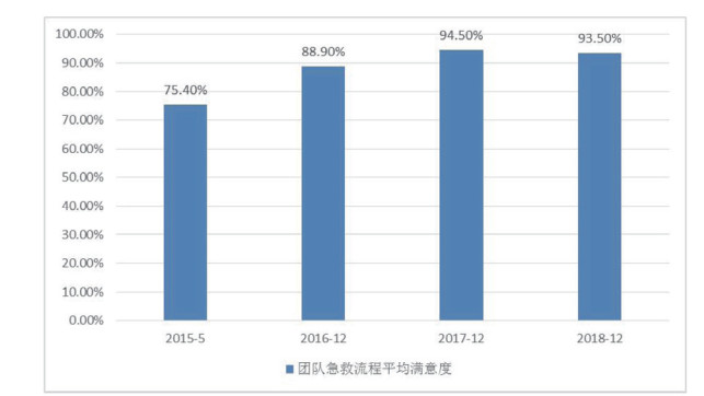2015年5月,TAVR团队14人,团队急救流程平均满意度75.4%;2016年12月,TAVR团队17人,团队急救流程平均满意度88.9%;2017年12月,TAVR团队20人,急救流程平均满意度94.5%;2018年12月,TAVR团队22人,满意度93.5%;2019年12月,TAVR团队25人,急救流程平均满意度95.5%。见图 3