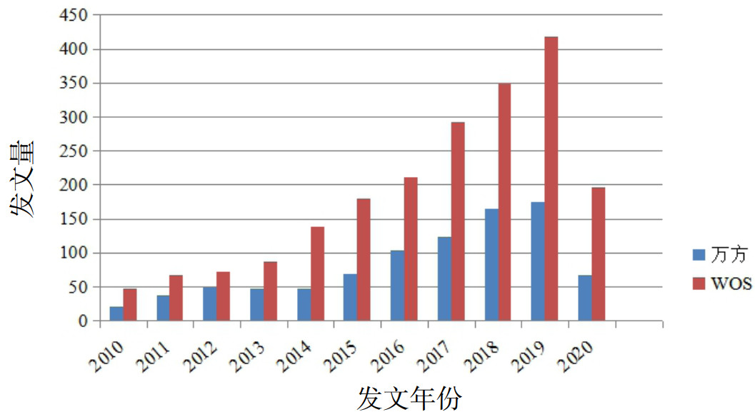 | 图 1 2010至2020年万方数据与Web of Science中PoCUS研究领域发文量变化趋势 |