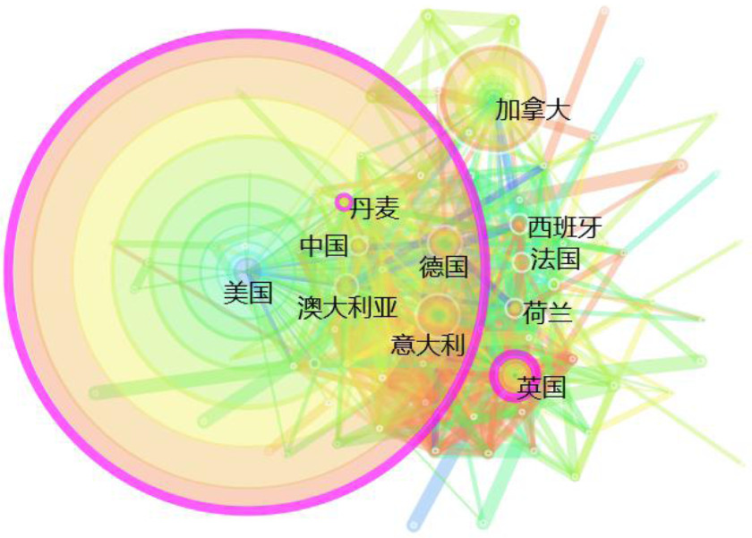 | 圆圈大小代表发文量,圆圈越大代表发文量越多;紫色圆圈的节点代表较高的中介中心性;节点间的连线代表合作密切程度,连线越粗代表合作越紧密 图 2 2010至2020年Web of Science中PoCUS研究领域国家共现网络 |