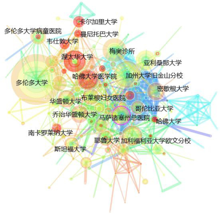 国际上发文量排名前3位的研究机构依次为多伦多大学、加州大学旧金山分校、梅奥诊所;在中介中心性方面,排名前3位的研究机构依次为马萨诸塞州总医院、多伦多大学、华盛顿大学,分别为0.12、0.07和0.06(表 2,图 3)。国内发文量排名前3位的研究机构分别为四川大学华西医院、北京协和医院、解放军总医院(表 2)。