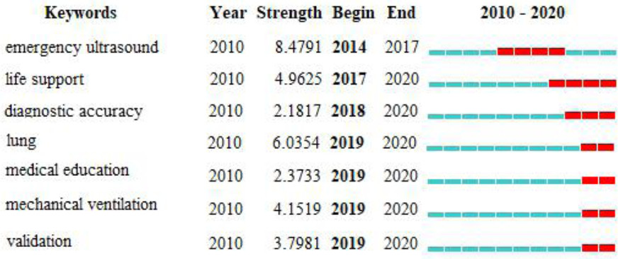 利用基于Web of Science数据库构建的关键词共现网络,根据Burst指数及其持续时间进行突增关键词探测。结果显示“急诊超声”“生命支持”“诊断准确性”“肺”“医学教育”“机械通气”的出现频次仍处于快速增长阶段(图 5)。