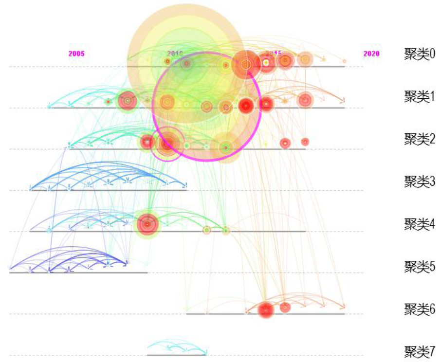 | 图 7 2010至2020年Web of Science中PoCUS研究领域文献共被引网络前8位大型聚类Timeline图 |