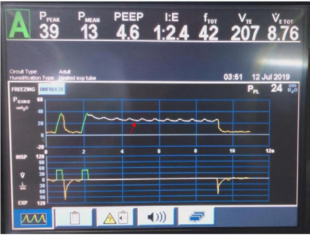 | 图 1 压力-时间曲线可见吸气暂停期间气道压力规律波动,如红色箭头所示 |