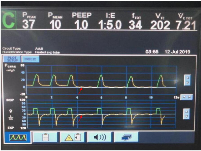 | 图 2 可见呼气期间,气道压力及流量曲线的波动,如红色箭头所示 |