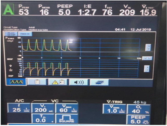 | 图 3 当调整触发灵敏度为1 L/min时,呼吸频率可达76次/min,与心率一致 |