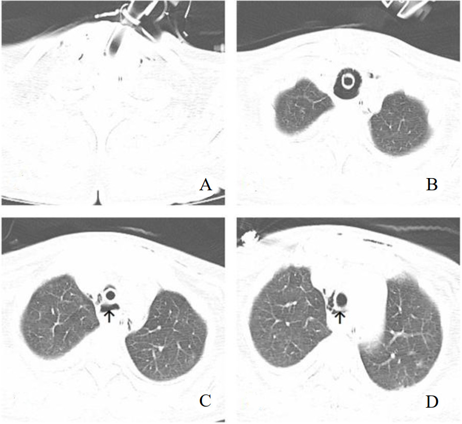 A:颈部少许皮下气肿;B:气管切开套管气囊部位未见明显异常;C:气管切开套管开口层面可见少许纵隔气肿,正后方可见气腔;D:气切套管下约1 cm层面,见气腔缩小;箭头示气腔 图 1 患者经皮扩张气管切开术后胸部CT