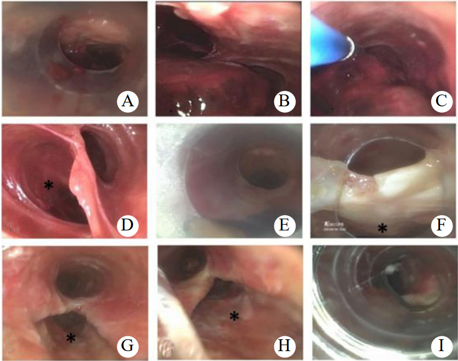 A-B:气管切开套管处,显示气管部分阻塞,可见血凝块;C:试用活检钳未能将血块捣碎;D:退镜后发现气管膜部撕裂损伤伴假腔形成;E:气管插管状态下可见膜部缺损;F:分隔处位于导管开口处,后壁为假腔;G:气管插管退至声门下可见假腔全貌;H:气管插管旁入镜见假腔全貌;I:更换加长型气管切开套管可见导管尖端位于分隔处,向远端送至2 cm后通过分隔处,完全进入真腔;星号示假腔 图 2 患者床边纤维支气管镜检查结果