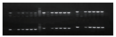 对纳入的研究对象采集外周静脉血2 mL(2.5%枸椽酸钠溶液抗凝)并封存于EDTA抗凝管中,使用血液基因组DNA提取试剂盒(SK8224)从血液样本中提取基因组DNA,对提取后的DNA进行PCR扩增,利用2%琼脂糖凝胶电泳分离PCR扩增产物,并运用紫外分光光度计分析DNA样本的纯度和浓度。电泳图见图 1