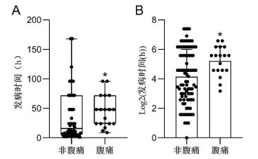 腹痛组患儿发病时间(A)以及Log2发病时间对数(B)均较非腹痛组患儿显著延长(P<0.05)。其中两组Log2发病时间对数呈正态分布 图 1 腹痛组和非腹痛组睾丸扭转患儿的发病至手术时间