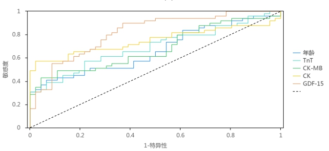 病例组采用股静脉穿刺抽血采集入院10 min内首次血液样本:肌钙蛋白T(troponin t,TnT), 肌酸激酶(creatine kinase,CK),肌酸激酶同工酶(creatine kinase isoenzyme MB,CK-MB), GDF15。对照组采取肘正中静脉穿刺抽血采集血液样本。