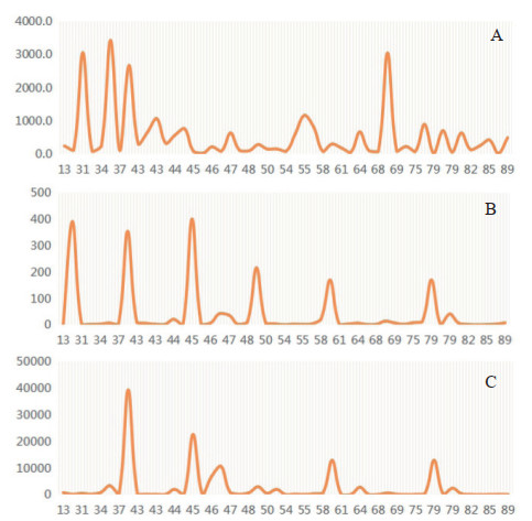 2A为CK-MB;2B为CK;2C为GDF1 图 2 CK-MB、CK及GDF15在SD人群众分布图。 Fig 2 Distribution of CK-MB, CK and GDF15 in SD.