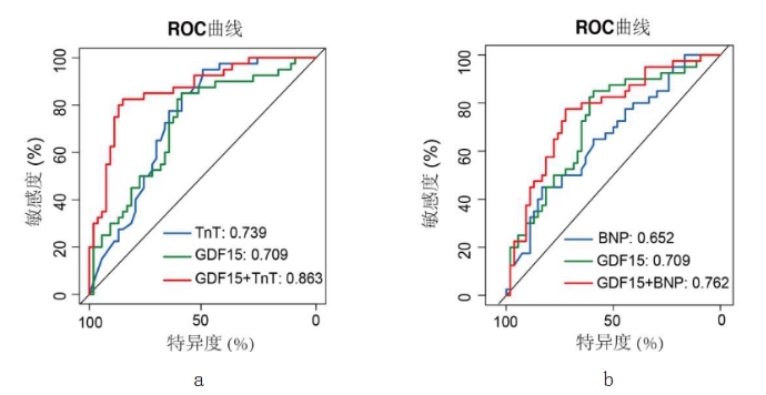 TnT,GDF15,TNT联合GDF15的AUC值分别为0.739、0.709、0.863,而BNP以及TNT+BNP作为指标的AUC值分别为0.652、0.762。与传统的诊断标志物相比较,TnT联合GDF15具有更加良好的诊断价值(见图 2)。
