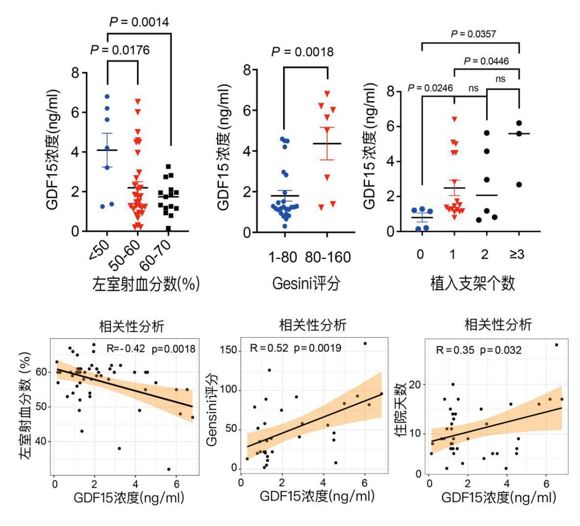 2.5 GDF15与心脏射血分数、Gensini评分、患者住院天数之间的关系