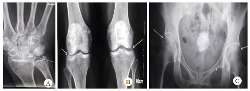 | 图 1 关节X平片。A.右腕关节间隙(箭头所指),B.双膝关节(箭头所指),C.双髋关节(箭头所指),均可见软骨钙化影 |