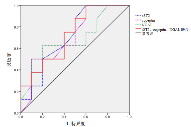 | 图 1 sST2、Copeptin、NGAL联合对肺心病难治性心力衰竭患者不良事件预测的曲线 |