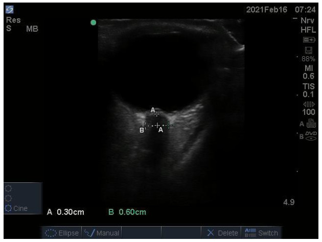 图 1 超声测量视神经鞘直径示意图 Fig 1 Ultrasound measurement of optic nerve sheath diameter