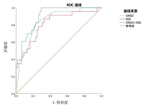 此外,本研究通过受试者工作特征曲线分析显示,超声测量ONSD联合NSE预测重症脑损伤患者死亡风险的效能明显优于两者单独评估,其曲线下面积为三者中最大,且灵敏度为100%,特异度为70.5%。